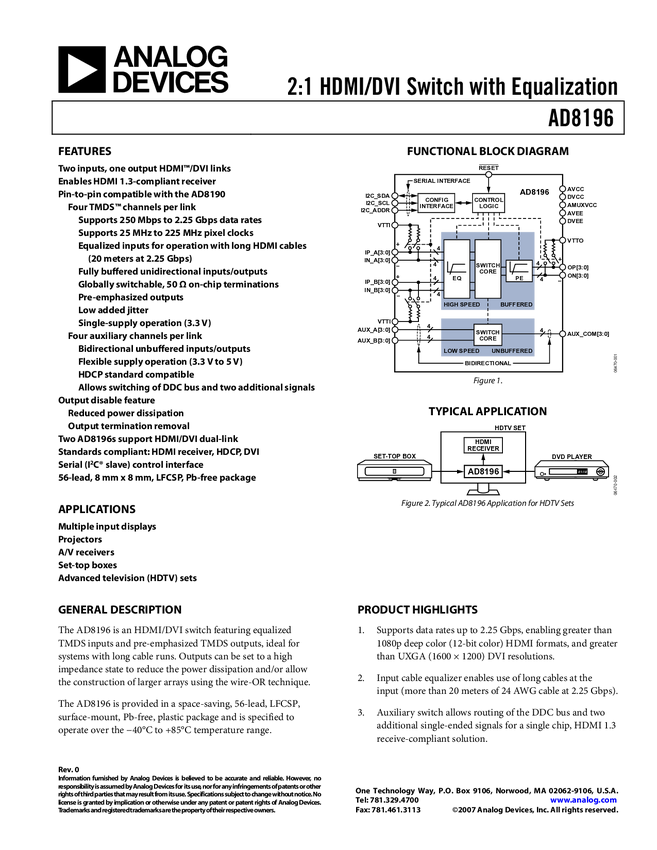 AD8196 2:1 HDMI/DVI Switch with Equalization