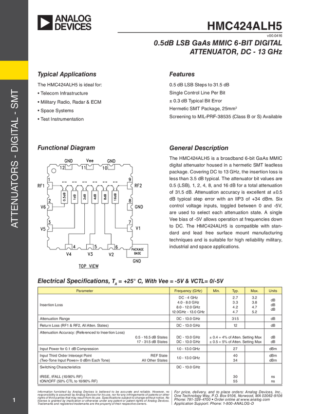 HMC424ALH5 0.5dB LSB GaAs MMIC 6-Bit Digital Attenuator, DC - 13 GHz