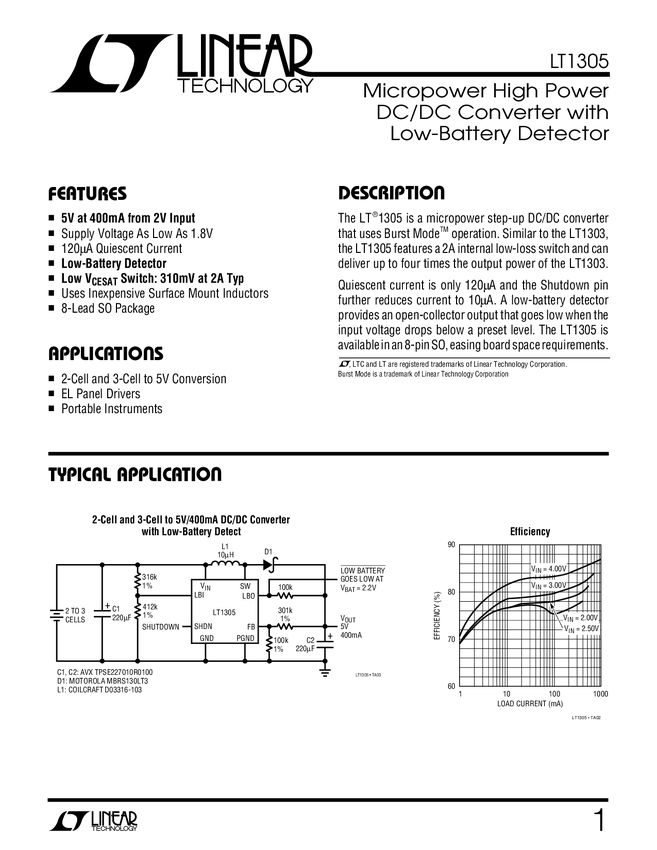 LT1305 Micropower High Power DC/DC Converter with Low-Battery Detector