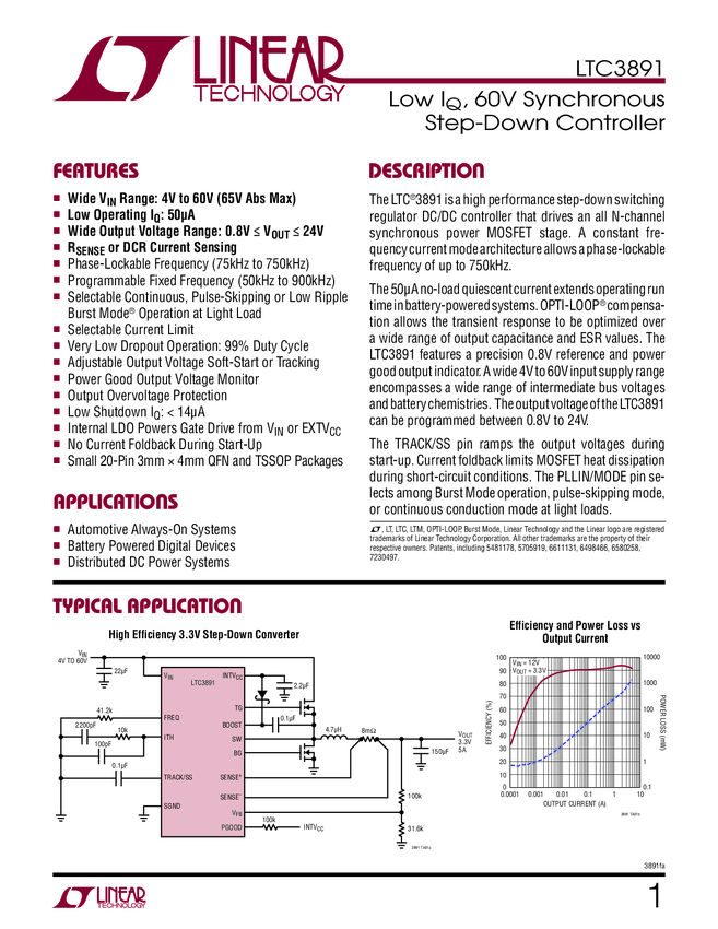 LTC3891 Low I, 60V Synchronous Step-Down Controller