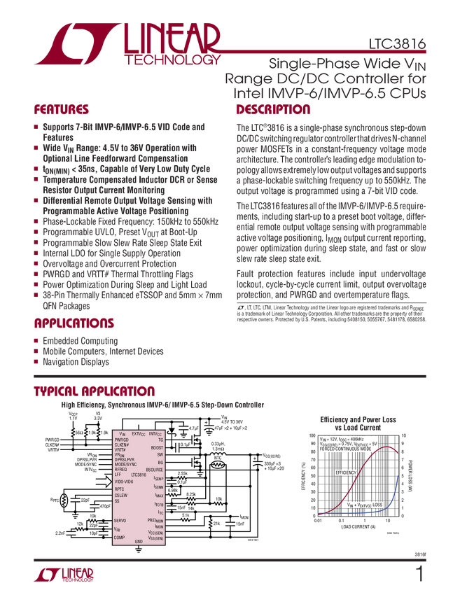 LTC3816 Single-Phase Wide V Range DC/DC Controller for Intel IMVP-6/IMVP-6.5 CPUs