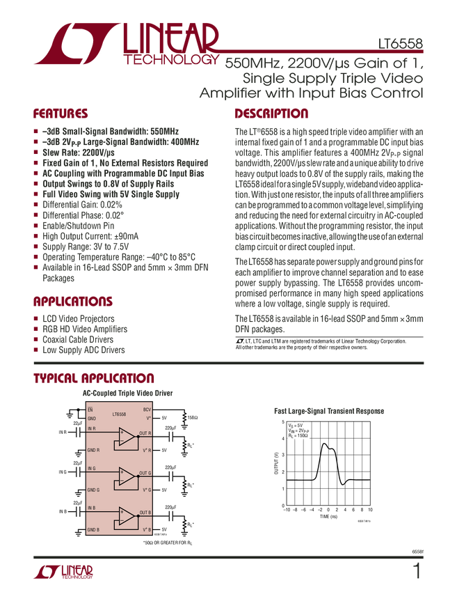 LT6558 550MHz, 2200V/µs Gain of 1, Single Supply Triple Video Amplifier with Input...