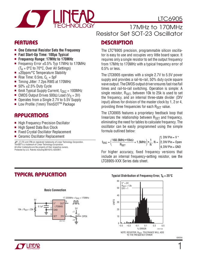 LTC6905 17MHz to 170MHz Resistor Set SOT-23 Oscillator