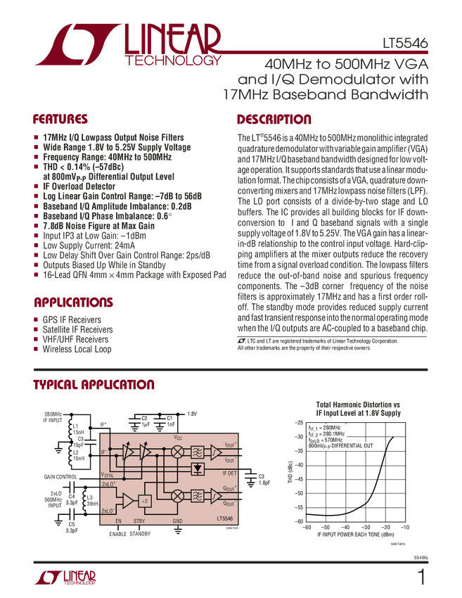 LT5546 40MHz to 500MHz VGA and I/Q Demodulator with 17MHz Baseband Bandwidth