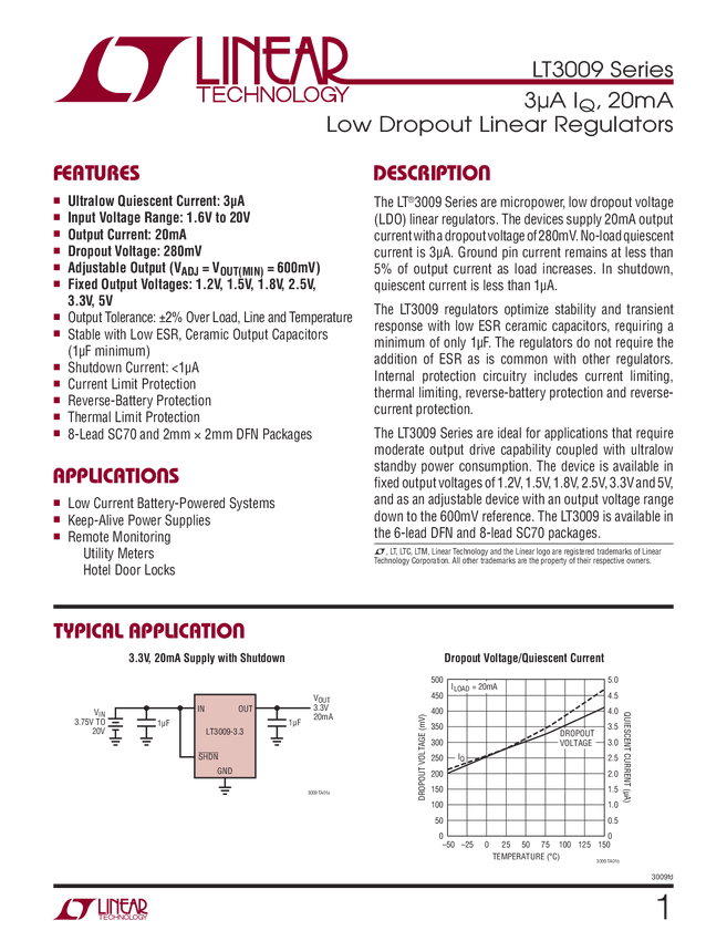 LT3009 3µA I, 20mA Low Dropout Linear Regulators