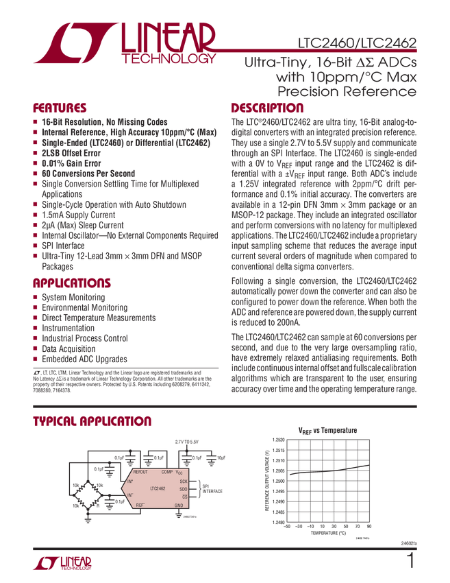 LTC2462 Ultra-Tiny, 16-Bit ΔΣ ADCs with 10ppm/°C Max Precision Reference