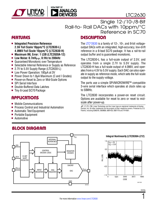 LTC2630 Single 12-/10-/8-Bit Rail-to-Rail DACs with Integrated Reference in SC70