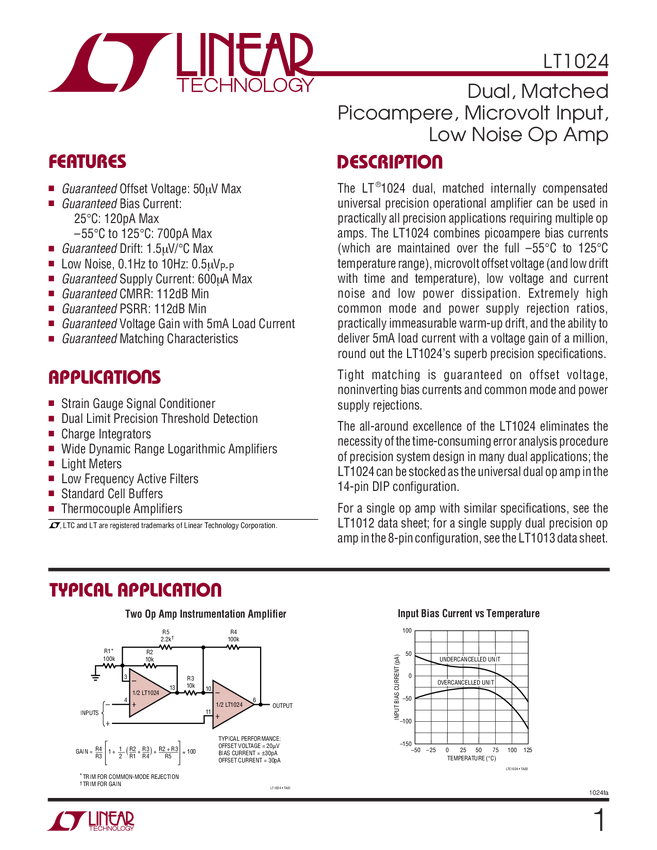 LT1024 Dual, Matched Picoampere, Microvolt Input, Low Noise Op Amp