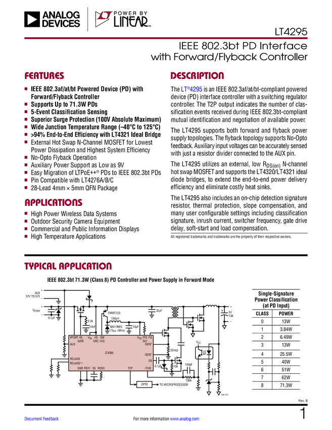 LT4295 IEEE 802.3bt PD Interface with Forward/Flyback Controller