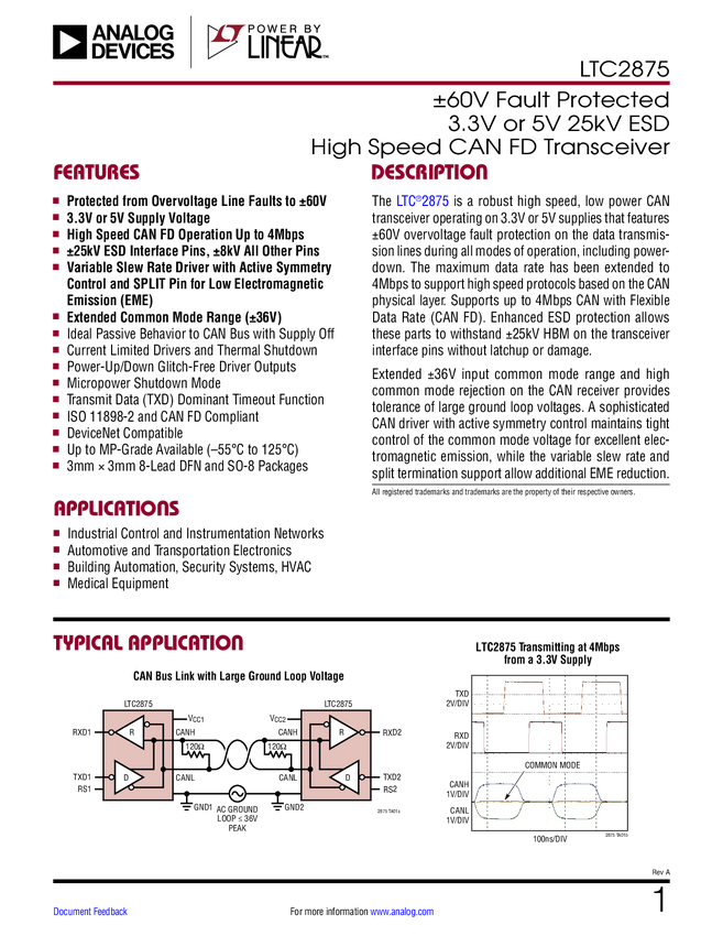 LTC2875 ±60V Fault Protected 3.3V or 5V 25kV ESD High Speed CAN FD Transceiver