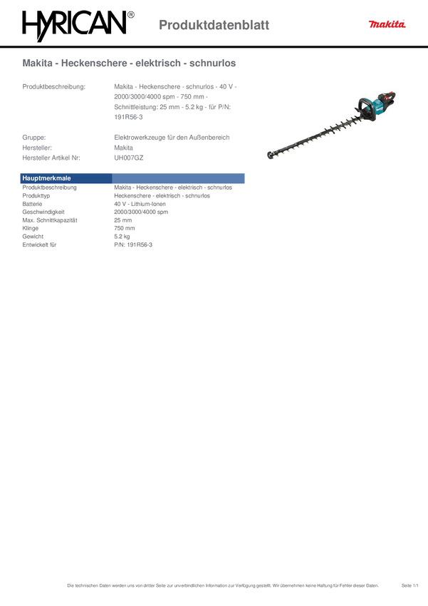 UH007GZ Makita UH007GZ akumulatorowy Nożyce do żywopłotu 40 V Li-Ion 750 mm