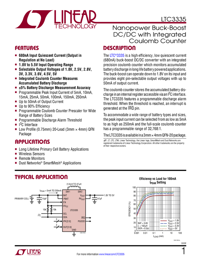 LTC3335 Nanopower Buck-Boost DC/DC with Integrated Coulomb Counter