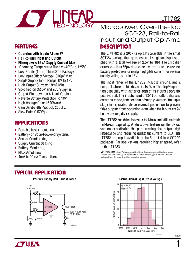 LT1782 Micropower, Over-The-Top SOT-23, Rail-to-Rail Input and Output Op Amp