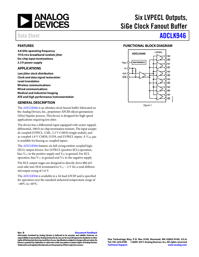 ADCLK946 Six LVPECL Outputs, SiGe Clock Fanout Buffer