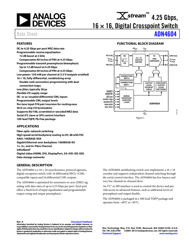 ADN4604 X-STREAM™ 4.25 Gbps, 16 × 16, Digital Crosspoint Switch