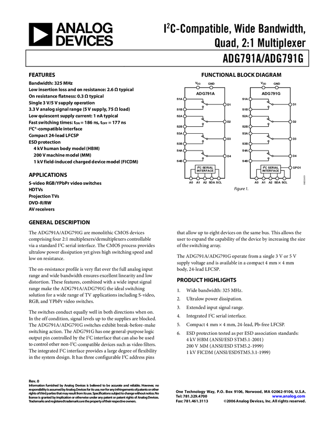 ADG791A IC®-Compatible, Wide BW, 4-Channel SPDT Switch