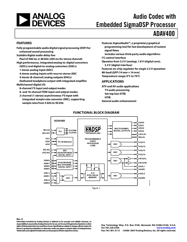ADAV400 Audio Codec with Embedded SigmaDSP Processor