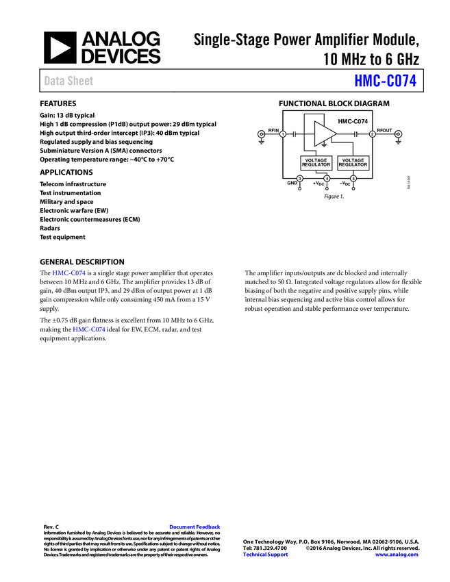 HMC-C074 Single Stage Power Amplifier Module, 10 MHz to 6 GHz