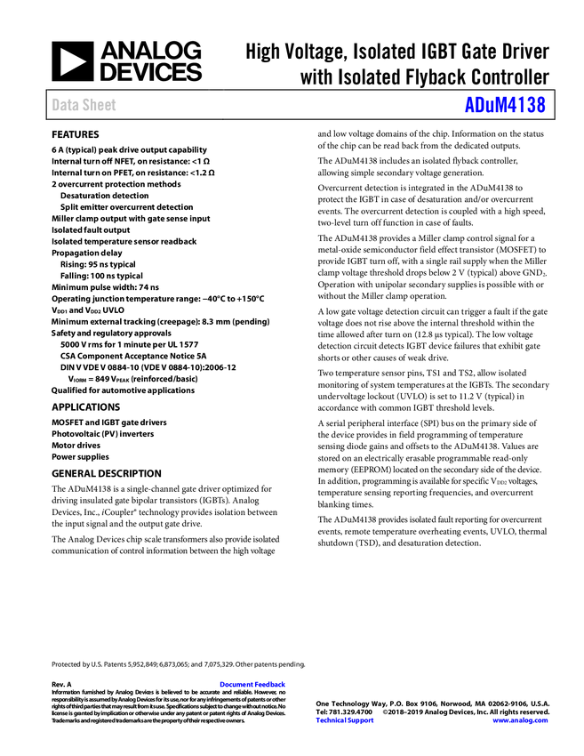 ADuM4138 High Voltage, Isolated IGBT Gate Driver with Isolated Flyback Controller