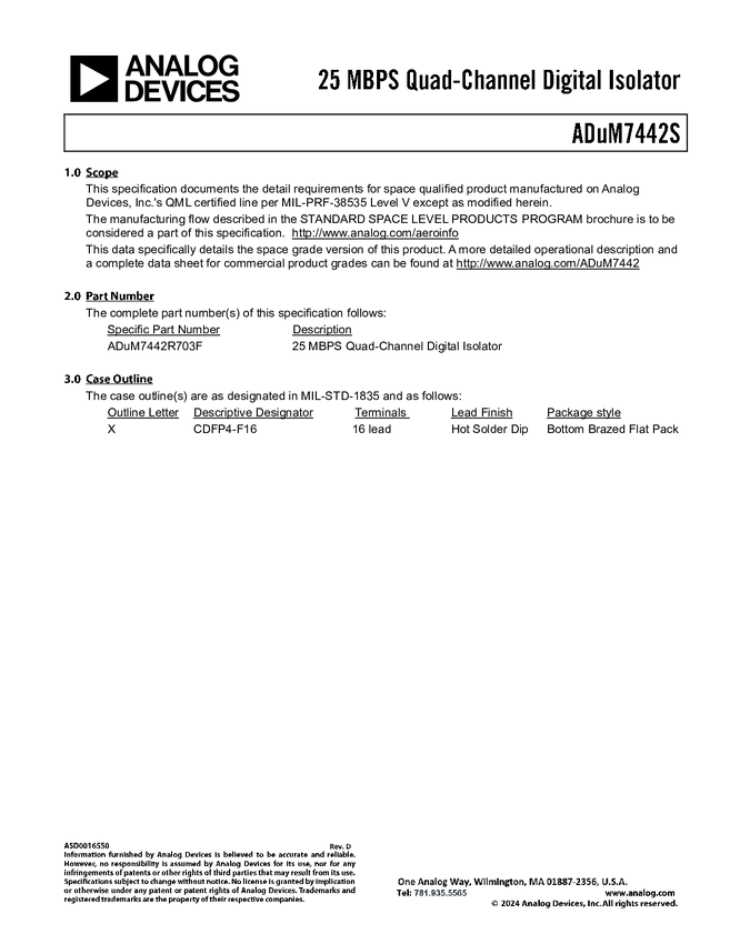 ADuM7442S Aerospace 25 MBPS Quad-Channel Digital Isolator