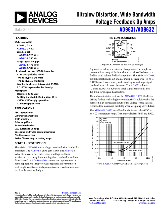 AD9632 Ultralow Distortion, High Speed Op Amp, Stable at Gain of 2