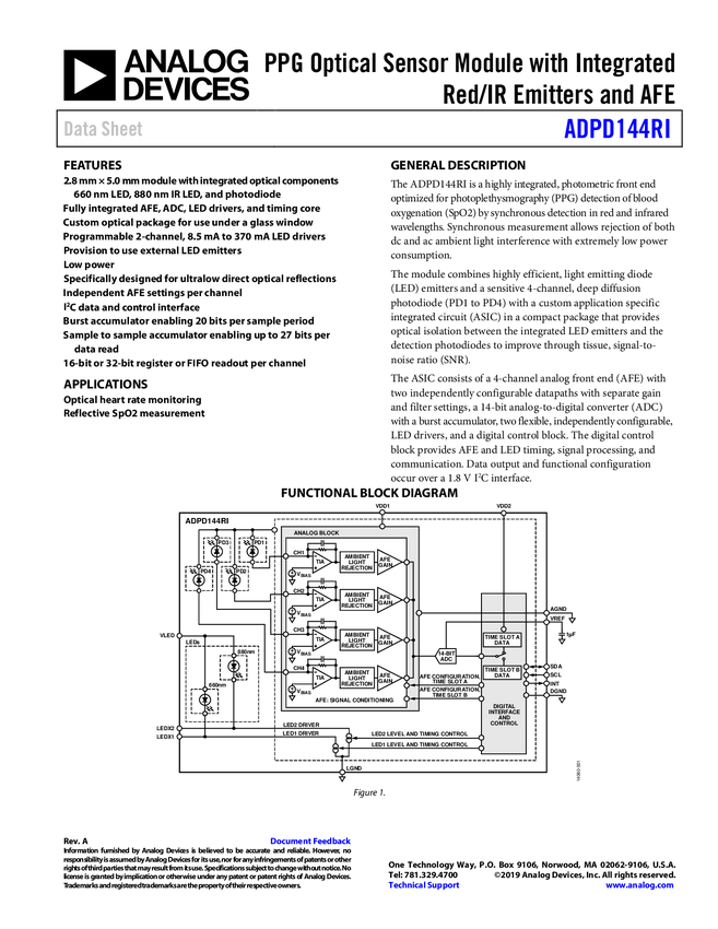 ADPD144RI PPG Optical Sensor Module with Integrated Red/IR Emitters and AFE