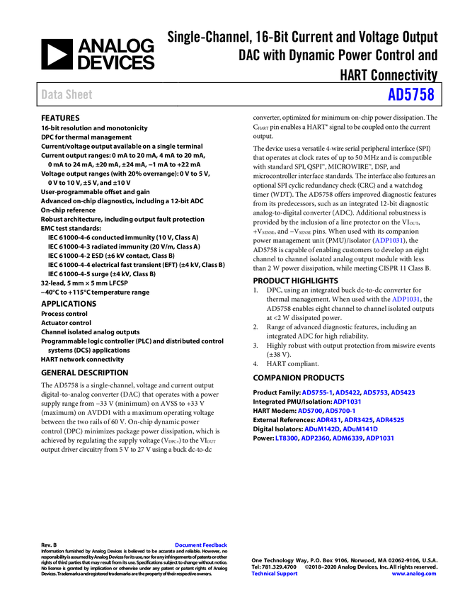 AD5758 Single-Channel, 16-Bit Current and Voltage Output DAC with Dynamic Power Co...