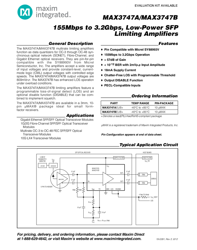 MAX3747A 155Mbps to 3.2Gbps, Low-Power SFP Limiting Amplifiers