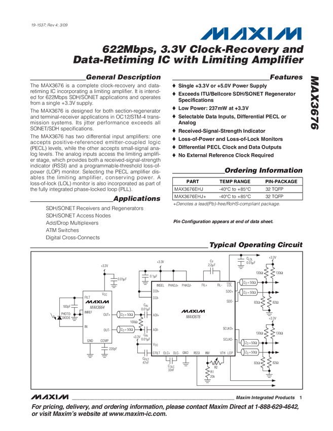 MAX3676 622Mbps, 3.3V Clock-Recovery and Data-Retiming IC with Limiting Amplifier