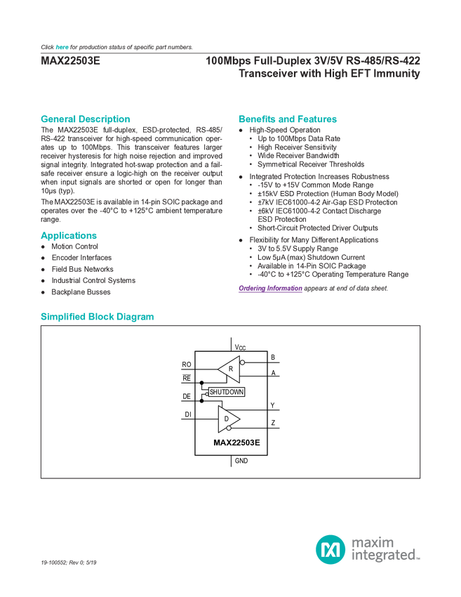 MAX22503E 100Mbps Full-Duplex 3V/5V RS-485/RS-422 Transceiver with High EFT Immunity