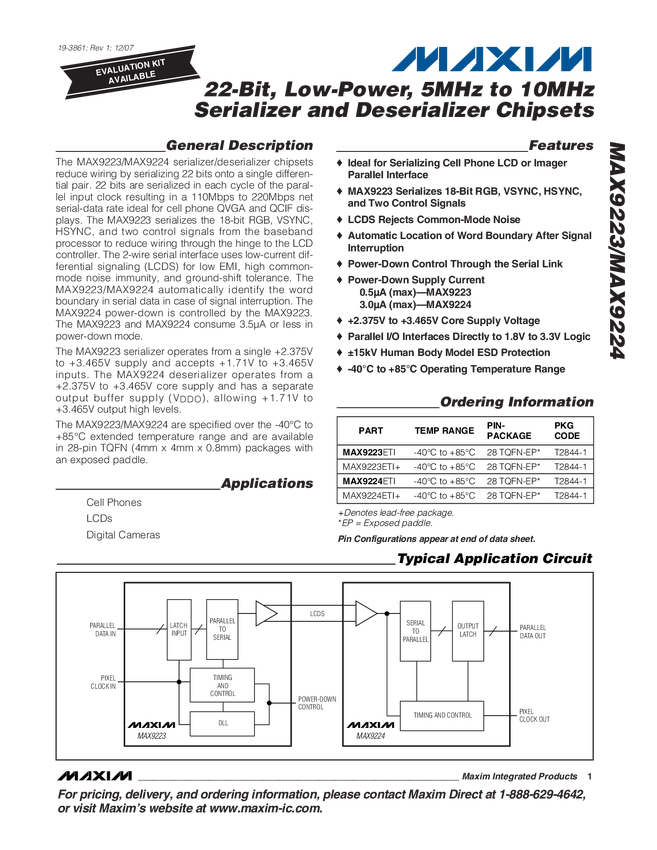MAX9223 22-Bit, Low-Power, 5MHz to 10MHz Serializer and Deserializer Chipsets