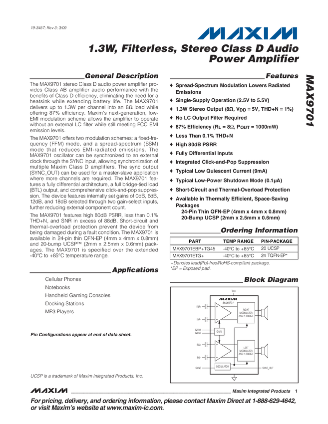 MAX9701 1.3W, Filterless, Stereo Class D Audio Power Amplifier