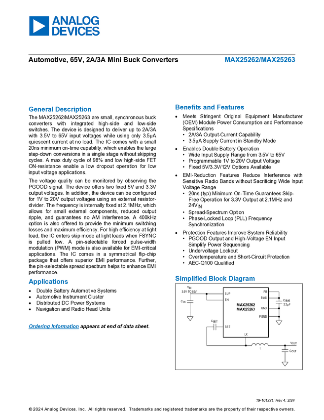 MAX25262 Automotive, 65V, 2A/3A Mini Buck Converter