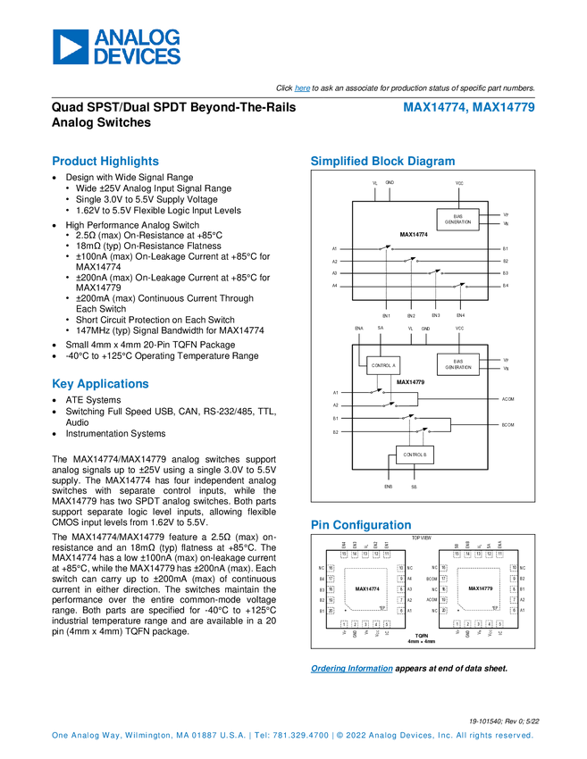 MAX14774 Quad SPST/Dual SPDT Beyond-The-Rails Analog Switches