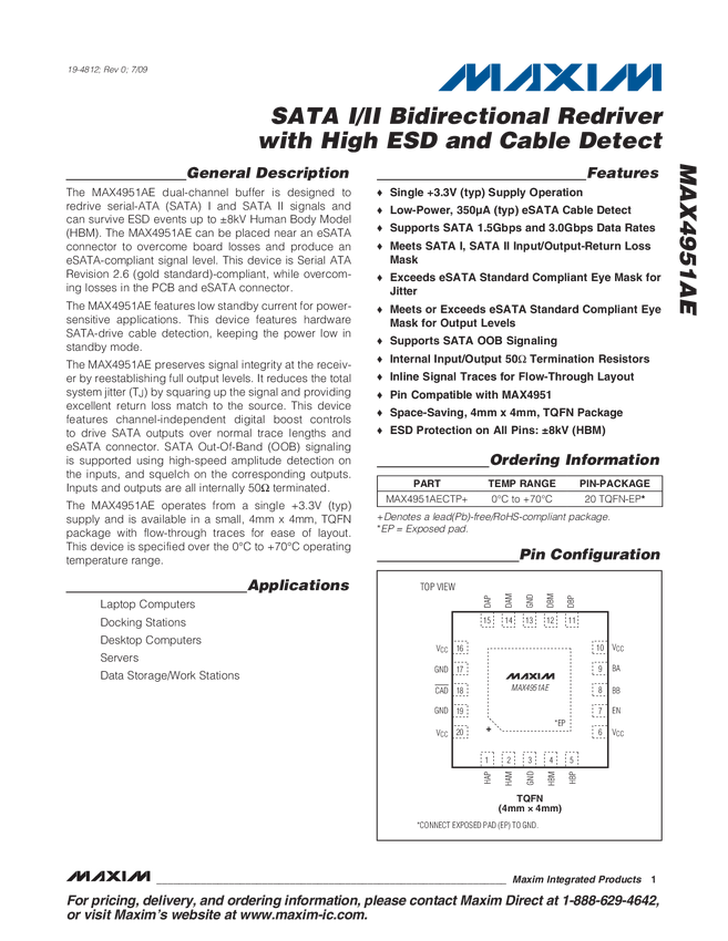 MAX4951AE SATA I/II Bidirectional Redriver with High ESD and Cable Detect