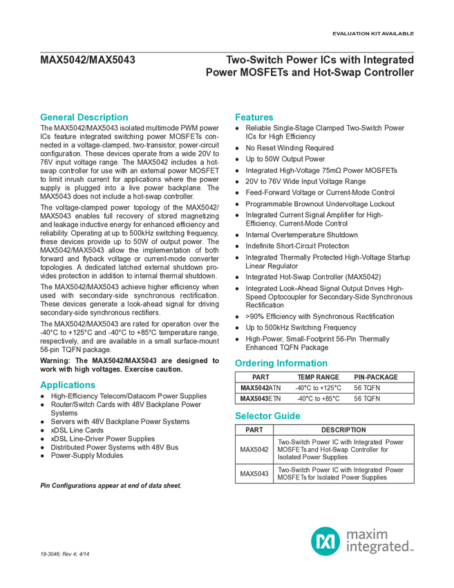 MAX5042 Two-Switch Power ICs with Integrated Power MOSFETs and Hot-Swap Controller