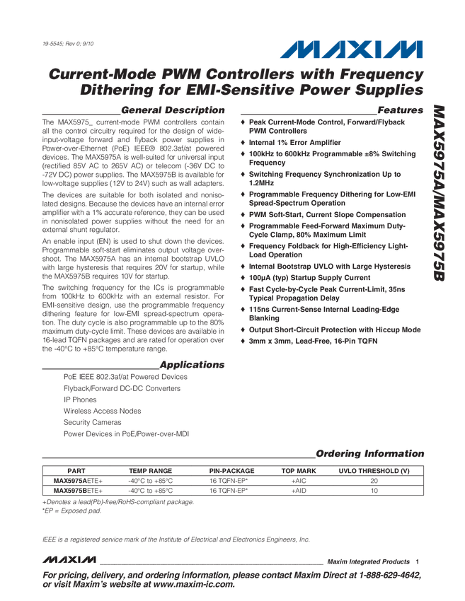 MAX5975B Current-Mode PWM Controllers with Frequency Dithering for EMI-Sensitive Pow...