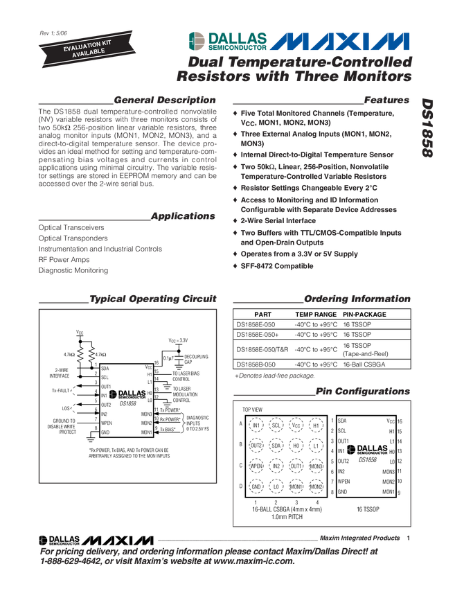 DS1858 Dual Temperature-Controlled Resistors with Three Monitors