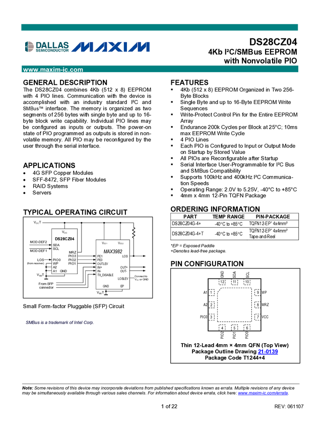 DS28CZ04 4Kb I²C/SMBus EEPROM with Nonvolatile PIO
