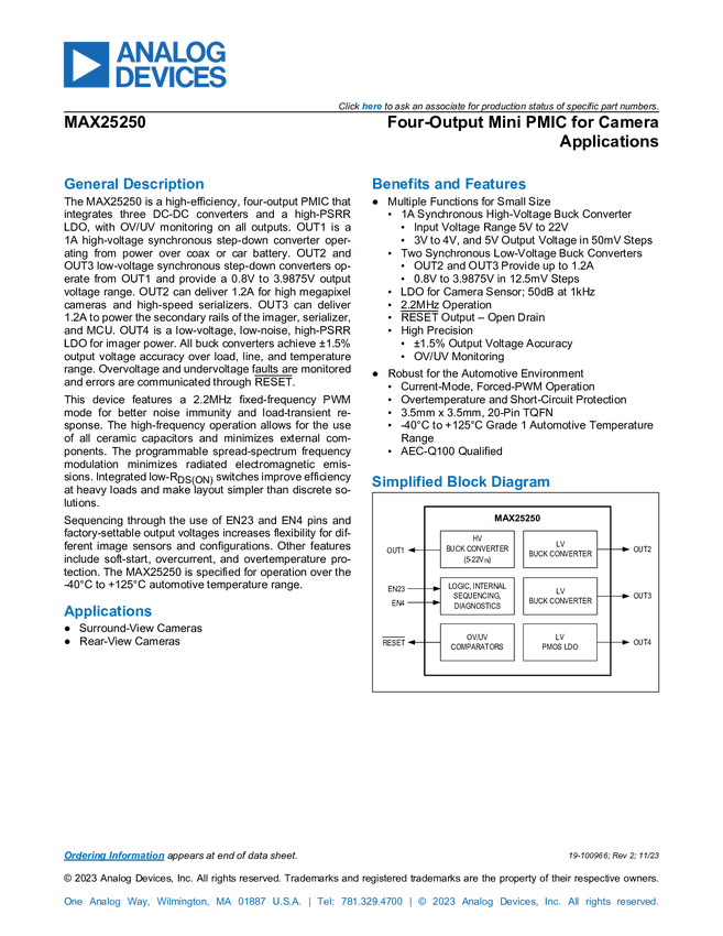 MAX25250 Four Output Mini PMIC for Camera Applications