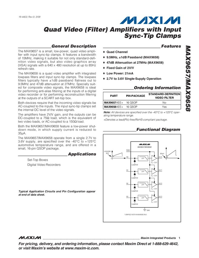 MAX9658 Quad Video (Filter) Amplifiers with Input Sync-Tip Clamps