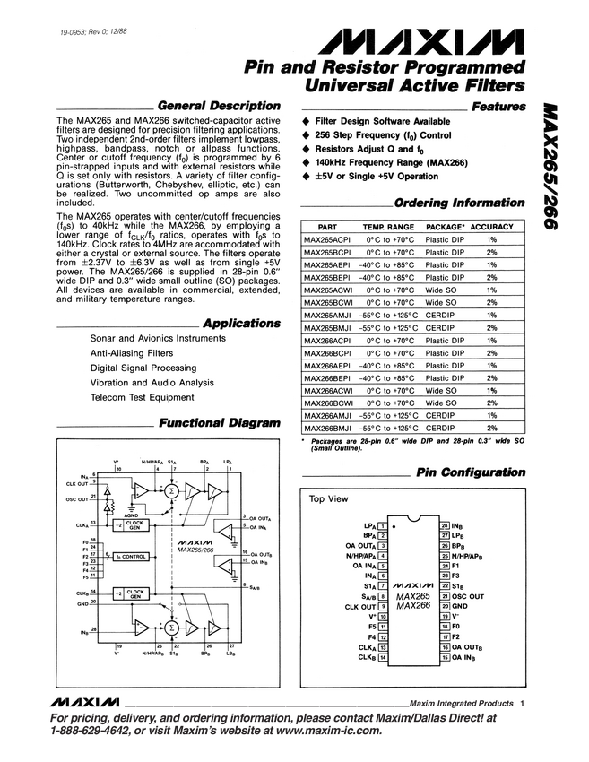 MAX266 Resistor-Pin-Programmable, Universal Switched Capacitor Filter