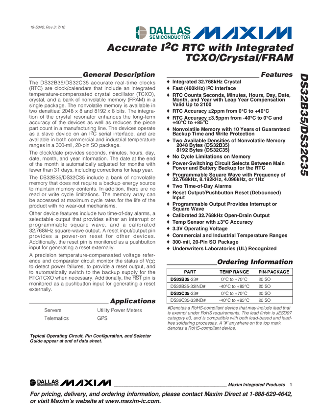 DS32B35 Accurate I²C RTC with Integrated TCXO/Crystal/FRAM
