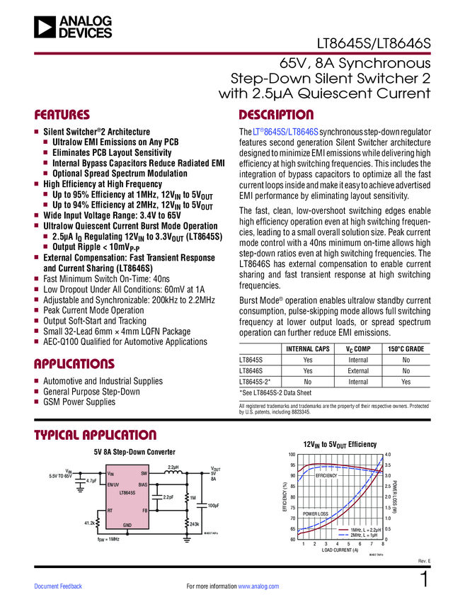 LT8646S 65V, 8A Synchronous Step-Down Silent Switcher 2 with 2.5μA Quiescent Curren...