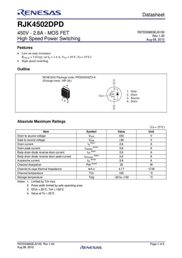 RJK4502DPD Nch Single Power Mosfet 450V 2.8A 3850Mohm Mp-3A/To-252