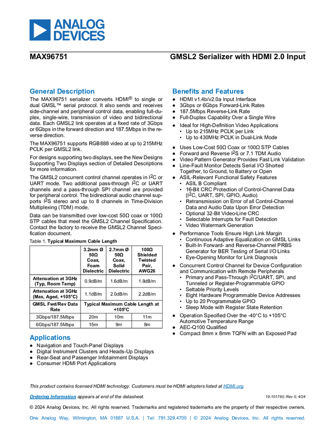 MAX96751 GMSL2 Serializer with HDMI 2.0 Input