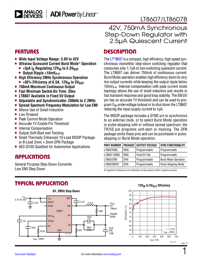 LT8607 42V, 750mA Synchronous Step-Down Regulator with 2.5μA Quiescent Current