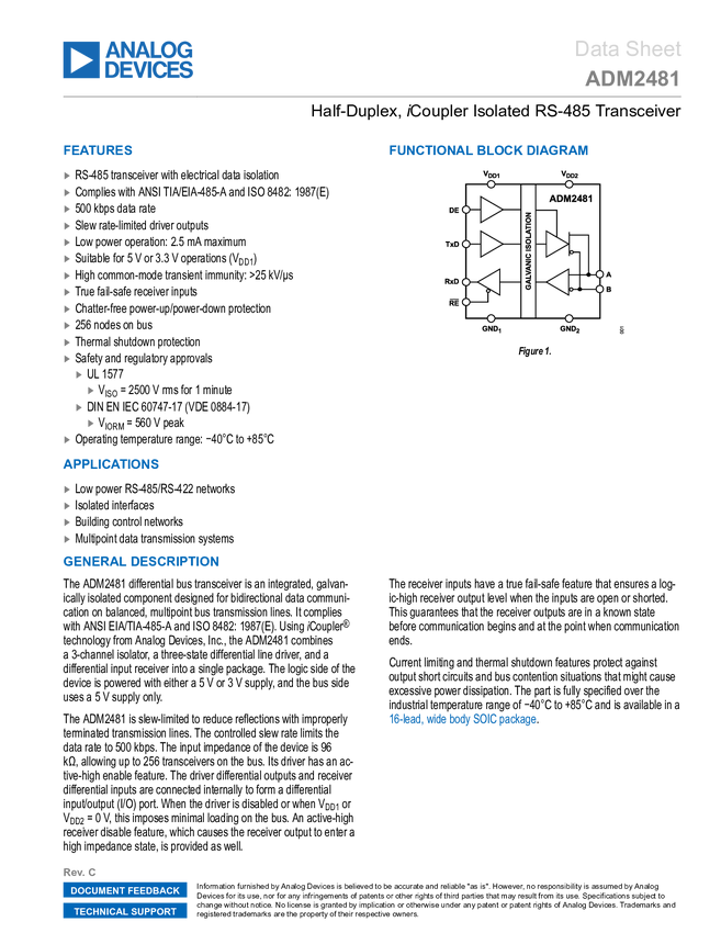 ADM2481 2.5 V Signal Isolated, 500 , Half Duplex RS-485 Transceiver