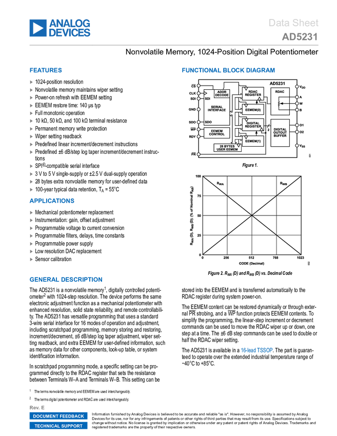 AD5231 Nonvolatile Memory, 1024-Position Digital Potentiometer