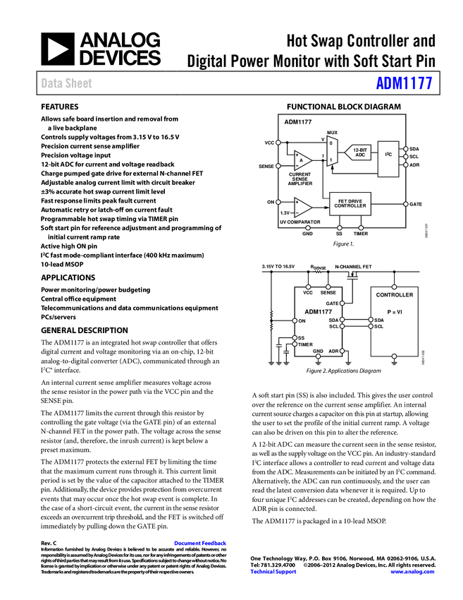 ADM1177 Hot Swap Controller and Digital Power Monitor with Soft Start Pin